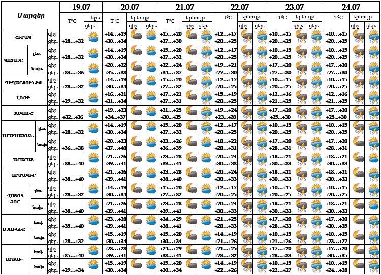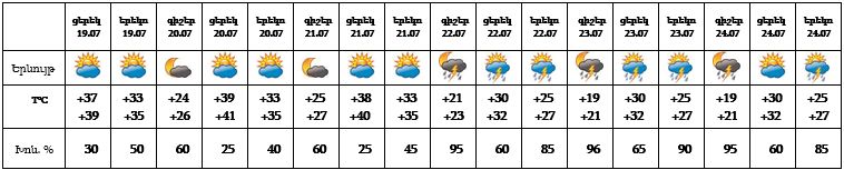 Օդի ջերմաստիճանը հուլիսի 19-20-ն աստիճանաբար կբարձրանա 3-5 աստիճանով, 22-23-ը կնվազի 8-10 աստիճանով: