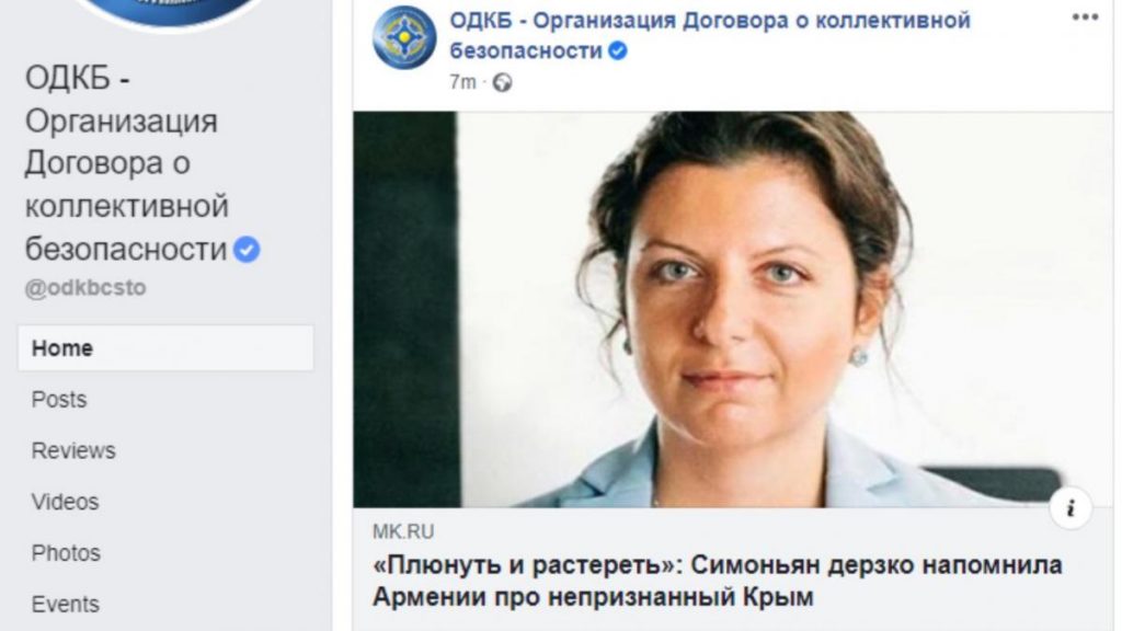 Հավաքական անվտանգության պայմանագրի կազմակերպության (ՀԱՊԿ) ֆեյսբուքյան պաշտոնական էջում դրվել է «Մոսկովսկի կոմսոմոլեց» թերթի հոդվածը՝ «Թքել և տրորել»․ Սիմոնյանը հանդգնորեն Հայաստանին հիշեցրել է չճանաչված Ղրիմի մասին» վերնագրով։