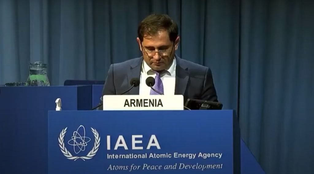 Նախարարն իր մտահոգություն է հայտնել Հայկական ԱԷԿ-ի նկատմամբ Ադրբեջանի կողմից հնչեցված սպառնալիքի վերաբերյալ՝ նշելով, որ Հայաստանը դիտարկում է այն որպես իրական սպառնալիք, ներկաների ուշադրությունը հրավիրելով այն փաստին, որ առաջին անգամ ատոմակայանի անվտանգությանն ուղղված իրական սպառնալիքը գալիս է ոչ թե ահաբեկչական կազմակերպության, այլ պետության անունից` վերջինիս պաշտոնական ներկայացուցչի միջոցով: «Հայ-ադրբեջանական սահմանի հյուսիսարևելյան ուղղությամբ զինված բախումների ժամանակ Ադրբեջանի ՊՆ պաշտոնական ներկայացուցչի կողմից բարձրացված Մեծամորի ատոմակայանին հարված հասցնելու սպառնալիքը ոչ այլ ինչ է, քան մարդկության դեմ ուղղված հանցագործություն և պետք է համապատասխան արձագանք ստանա միջազգային հանրության կողմից: Հայաստանը կշարունակի գործադրել բոլոր հնարավոր ջանքերը ապագայում նման սպառնալիքները կանխելու ուղղությամբ»,- ելույթում ասել է նախարարը։