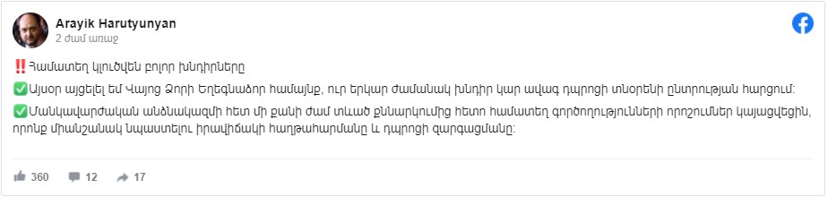 ՀՀ ԿԳՄՍ նախարար Արայիկ Հարությունյանը գրառում է կատարել Ֆեյսբուքի իր էջում, որում հայտնել է, որ այսօր այցելել է Վայոց ձորի Եղեգնաձոր համայնք, որտեղ «երկար ժամանակ խնդիր կար ավագ դպրոցի տնօրենի ընտրության հարցում»: