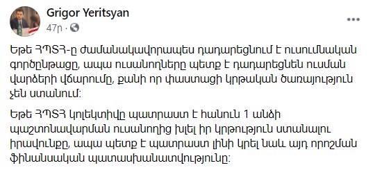 «Եթե ՀՊՏՀ-ը ժամանակավորապես դադարեցնում է ուսումնական գործընթացը, ապա ուսանողները պետք է դադարեցնեն ուսման վարձերի վճարումը, քանի որ փաստացի կրթական ծառայություն չեն ստանում։