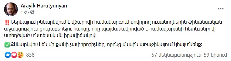 Ներկայում քննարկվում է վճարովի համակարգում սովորող ուսանողներին ֆինանսական աջակցություն ցուցաբերելու հարցը, որը պայմանավորված է համավարակի հետևանքով ստեղծված տնտեսական իրավիճակով»։