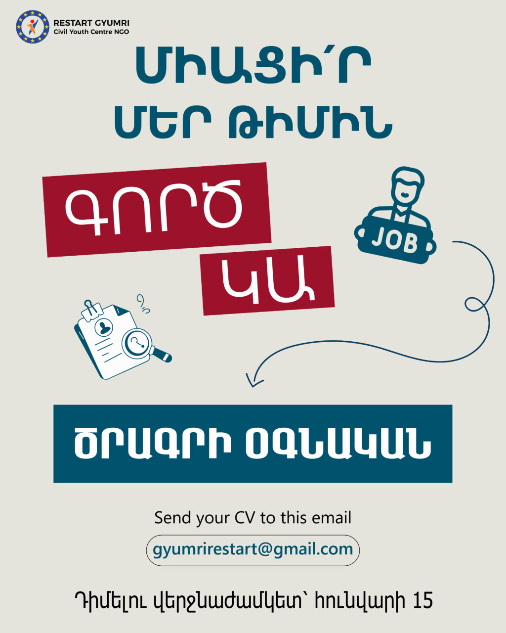 📢 «Ռեստարտ Գյումրի» երիտասարդական-քաղաքացիական կենտրոնը հրավիրում է փորձառու և նախաձեռնող երիտասարդներին միանալու մեր ակտիվ, ջերմ և երիտասարդական աշխատանքային միջավայրին։